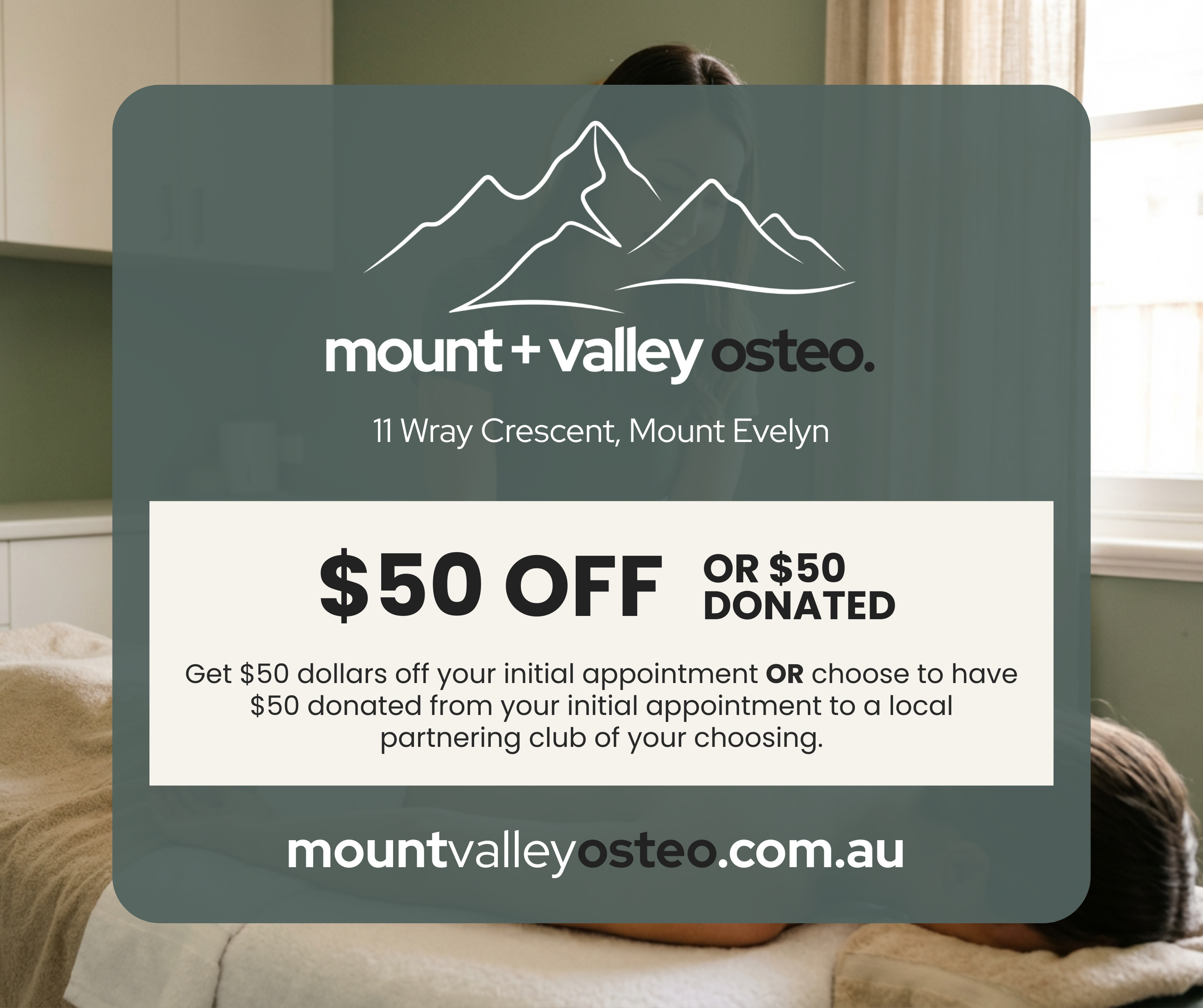 To say Hello and to support the local community we are offering $50 off your initial appointment, however, we have also teamed up with the local sporting clubs listed below for a special promotion.
